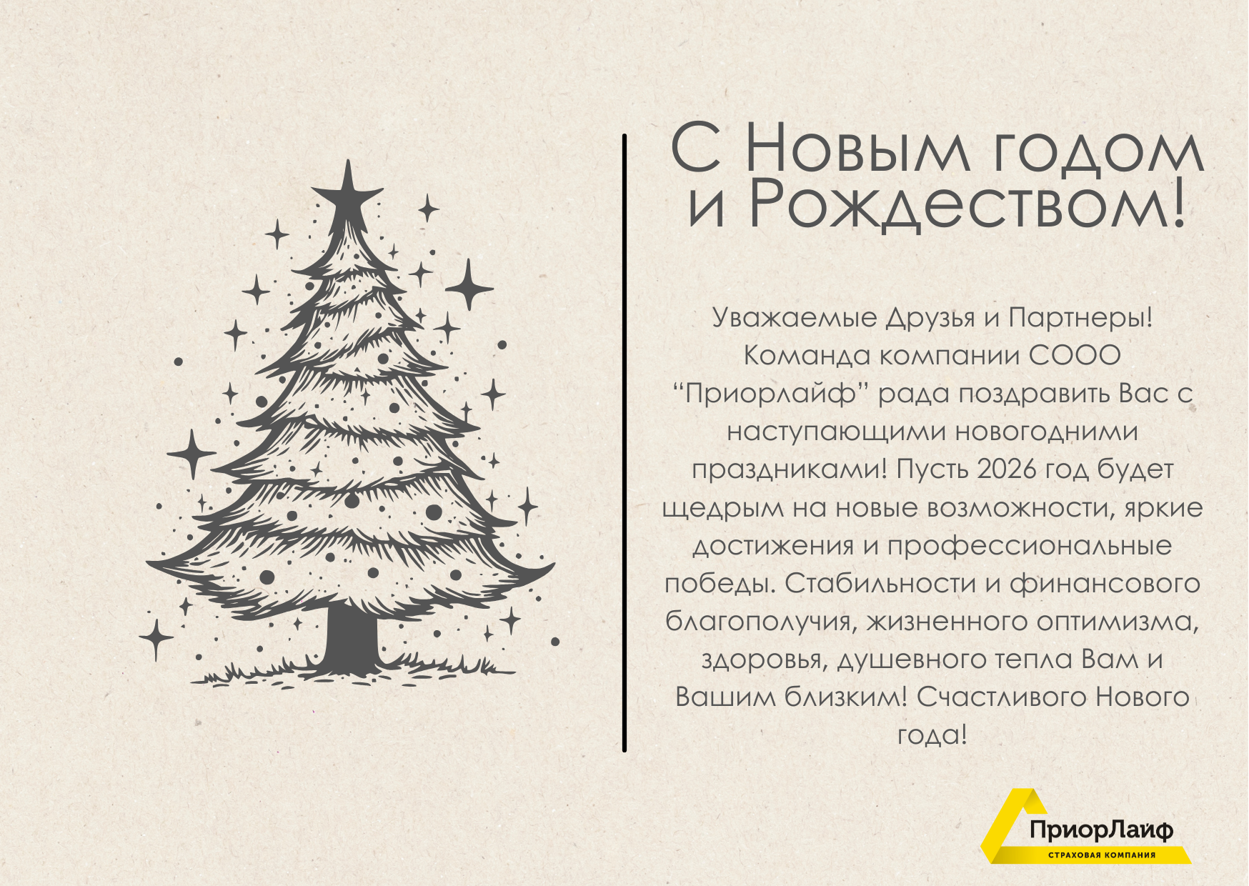 От лица всей команды «Приорлайф» поздравляем вас с наступающими праздниками! Мы искренне благодарим вас за доверие, которое вы оказываете нам, выбирая нас для защиты своего будущего и благополучия своих близких. Ваша уверенность в завтрашнем дне — наш главный приоритет и стимул для развития.